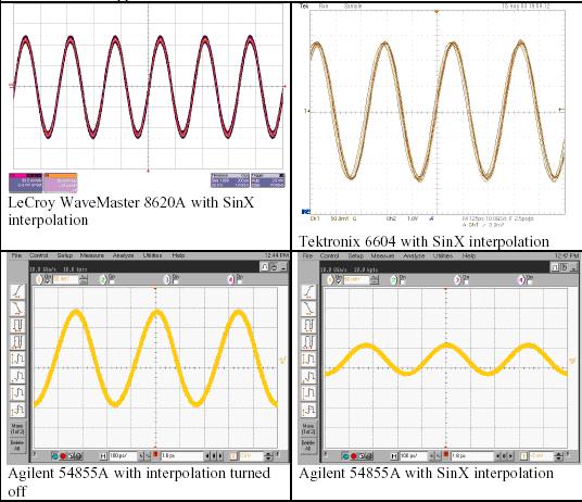 我們使用三種競爭的DSO進行簡單的試驗,其分別是力科Wavemaster 8620A、泰克6604和安捷倫54855A。這三種示波器的帶寬指標都是6 GHz,最大采樣率是20 GS/s。我們使用六種不同的信號和采樣率組合,說明SinX內插算法的性能。