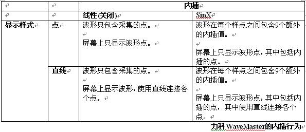 下表詳細介紹了在WaveMaster上怎樣應用內插及怎樣顯示波形的規則。