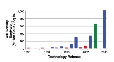 圖2顯示了Fairchild公司≤30V的N溝道MOSFET單元密度的進步。每個條形都表示新的工藝進步。可以看到,在最近的十年中,單元密度從3200萬單元/平方英寸增加到現在的10億單元/平方英寸。