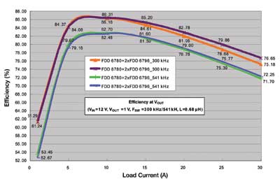 注意上面的兩條曲線,在滿載(30A)時,可以看到最新的器件的效率有1.5%的改進。同樣還是這兩條曲線,在負荷較小(15A)時,可以實現0.69%的改善。如果對整個負荷范圍積分,那么與今天常見的方案相比,使用最新的MOSFET器件時平均功率損耗可以降低8%~10%。即使在較高的開關頻率541kHz處,可以看到在負荷小時系統級效率仍然高于80%,而在滿載時效率大于70%。如果頻率繼續增加,那么開關損耗將急劇增加。