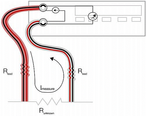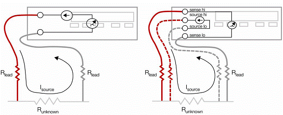 源端引線中的串聯(lián)電阻不影響電流流動(dòng)。測量/傳感引線幾乎沒有電流流動(dòng),因?yàn)閮x表的輸入阻抗很高。這意味著測量引線中沒有IxR電壓下跌。因此,您只需測量由于流經(jīng)的源電流而在未知電阻器中產(chǎn)生的電壓下跌。