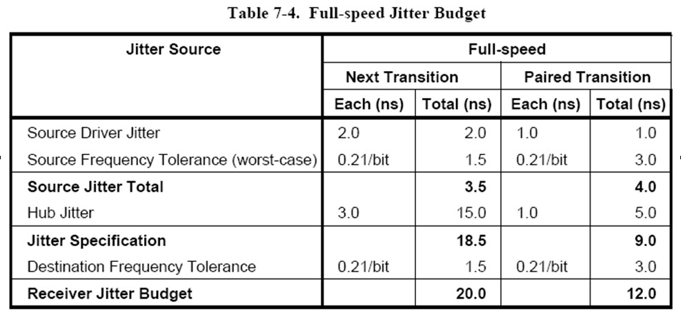 USB2.0是一種復雜的總線結(jié)構(gòu),既包括高速、全速、低速三種速率級別,也包括主機、設備、集線器三類產(chǎn)品,每種類別又包括多個參數(shù)需要測試,幅度、抖動、時序、過程等特性都需要一一分析是否滿足規(guī)范要求。USB2.0一致性測試規(guī)范對HighSpeed的Device分析就定義了幾十個參數(shù)。每一種參數(shù)的測量對于示波器的使用都定義了設置參數(shù),如下1就是USB-IF對全速抖動測試的容限范圍規(guī)定: