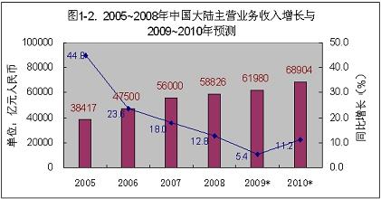 據(jù)工業(yè)和信息化部運(yùn)行監(jiān)測(cè)協(xié)調(diào)局統(tǒng)計(jì),今年1~9月份,中國大陸電子制造業(yè)主營業(yè)務(wù)收入35,285億元,同比增長-1.8%;從1月份的-15%收窄到9月份的-1.8%,平均每月收窄1.65個(gè)百分點(diǎn)。據(jù)此平均值推算,并考慮到第四季度一般要好于前三個(gè)季度的情況,規(guī)模以上電子信息制造業(yè)主營業(yè)務(wù)收入,將在10月份接近去年的同期水平,到今年年底,制造業(yè)主營業(yè)務(wù)收入應(yīng)能回升到3.2%,達(dá)到52,892億元(見圖1)。據(jù)工業(yè)和信息化部運(yùn)行監(jiān)測(cè)協(xié)調(diào)局統(tǒng)計(jì),今年1~9月份軟件業(yè)收入6775億元,同比增長20.3%,。如能繼續(xù)保持20%左右的增長,今年的軟件收入可達(dá)9,088億元。則2009年電子信息行業(yè)的總營業(yè)額將達(dá)到61,980億元(約折合9,115億美元),總營業(yè)額將比2008年增長5.4%。預(yù)計(jì)2010年,在國際經(jīng)濟(jì)回暖和繼續(xù)擴(kuò)大內(nèi)需的推動(dòng)下,中國大陸電子信息產(chǎn)業(yè)主營業(yè)務(wù)總收入將實(shí)現(xiàn)11.2%左右的增長,達(dá)到68,904億元(約折合10,133億美元)(見圖2)。