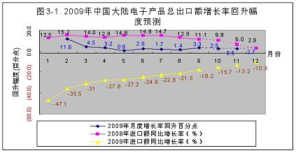 2008年下半年,國際金融風(fēng)暴席卷全球,以出口為主導(dǎo)的中國大陸電子信息產(chǎn)業(yè)直接受到?jīng)_擊,產(chǎn)品進(jìn)出口受阻,導(dǎo)致產(chǎn)品產(chǎn)量不斷下降,到今年元月份下降到谷底。由于中國政府及時(shí)實(shí)行積極的財(cái)政政策,調(diào)整產(chǎn)品結(jié)構(gòu),努力擴(kuò)大內(nèi)需,電子信息產(chǎn)業(yè)從2月份開始逐漸回升。雖然在個(gè)別月份有所波動(dòng),但回升趨勢(shì)穩(wěn)定向好。預(yù)計(jì)2009年全行業(yè)能實(shí)現(xiàn)5%左右的增長;進(jìn)出口額雖然有較大幅度的回升,但仍將呈現(xiàn)負(fù)增長;由于政府積極擴(kuò)大內(nèi)需,國內(nèi)市場(chǎng)將繼續(xù)保持10%左右的較快增長。