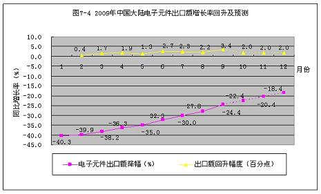 2009年1~9月份,中國大陸電子組件出口額增長率從元月份的-40.3%,回升到9月份的-24.4%。回升了15.9個(gè)百分點(diǎn)。按此回升速度計(jì)算,到今年年底,可回升到-18.4%(見圖7-4)。