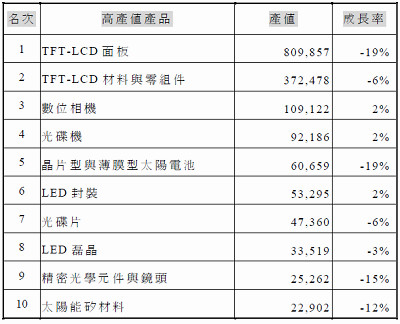 2009年臺(tái)灣地區(qū)1兆7,247億新臺(tái)幣的光電產(chǎn)值約相當(dāng)522億美元,擁有16%的全球市場占有率。臺(tái)灣地區(qū)有幾項(xiàng)產(chǎn)品的世界占有率仍能維持全球前三大,包括LED芯片、LED封裝、TFT LCD材料與零組件、TFT LCD面板、數(shù)字相機(jī)代工、光驅(qū)與光盤片,和光學(xué)鏡片,以及結(jié)晶硅太陽電池等。與往年類似,這十大產(chǎn)品即占有臺(tái)灣地區(qū)整體光電產(chǎn)值的94%比例。