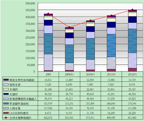 根據(jù)光電科技工業(yè)協(xié)進(jìn)會(huì)(PIDA)的分析,2009年全球光電市場持續(xù)受到全球金融風(fēng)暴的影響,又從2008年的4,220億美元,大幅衰退了23%,跌到3,235億美元,可謂創(chuàng)下有史以來最大的跌幅;更甚于1997年的亞洲金融風(fēng)暴和2000年的通訊市場泡沫化。預(yù)期全球光電市場將會(huì)于2010年反彈,成長16%;亦高于以往的成長率,然后再以10%左右逐年回升。