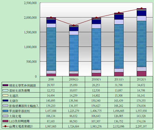 所幸景氣在2009年第一季跌到谷底之后便開始逐步回升,至第四季才確定恢復(fù)熱絡(luò)的景象。但是臺(tái)灣地區(qū)光電產(chǎn)業(yè)還是難抵金融風(fēng)暴的余威,整體產(chǎn)值下滑了13%,到1兆7,247億新臺(tái)幣。如原本所預(yù)估的,金融風(fēng)暴會(huì)犧牲掉兩年的成長率;保守預(yù)期臺(tái)灣地區(qū)光電產(chǎn)業(yè)將于2010年重拾成長,再度站回接近2兆新臺(tái)幣之規(guī)模。