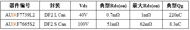 AUIRF7739L2 和 AUIRF7665S2 均符合 AEC-Q100 標準,是在 IR 要求零缺陷的汽車質(zhì)量理念下研制而成的,所采用的環(huán)保材料既不含鉛,也符合有害物質(zhì)管制指令 (RoHS)。