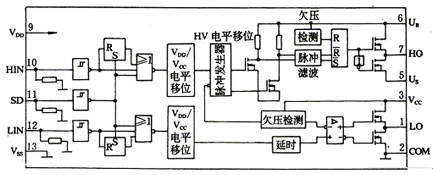 在大功率應用場合,由于上述驅動電路受驅動能力的限制,無法可靠地驅動大型MOSFET、IGBT。而集成驅動器的出現則很好地解決了這一問題。國內外已推出了多種具有保護功能的智能驅動器,如日本產的EXB841、EXB850,國產的M57959和CWK等。它們具有許多優點,如電路參數一致性好、運行穩定可靠、具有多種保護功能等。但它們最大的不足是需要單獨的浮地電源,給系統帶來了不便。最近IR公司推出了IR2110集成驅動器,它針對上述驅動器電源系統的不足,設置了自舉浮動電源,只需一路電源即可實現隔離驅動。對半橋、全橋式電路特別適用。IR2110的功能框圖如圖3所示。