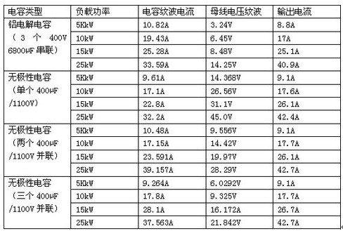 第三個替換試驗是用薄膜電容器替代660V交流輸入電壓變頻器中的鋁電解電容器。由于手頭沒有660V感應電機,負載只能采用電阻箱替代感應電機。其測試結果列于表3。