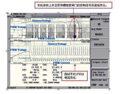 接著再次迅速提高盤式液壓,通過ABS傳動裝置增加制動力。換句話說,可通過增減盤式液壓防止制動器被鎖上。增加盤式液壓也就是用泵將液體壓入汽缸,會使泵馬達迅速工作。這個快速的馬達將影響控制螺旋管閥門的PWM電流信號。一般ABS操作無法得到這是否影響電池電壓波動。因此,有必要觀察這個電池電壓波動。