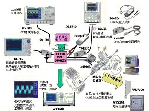 動力方向盤(EPS)在小型汽車中應用已經比較普及了,但在需大扭矩的大型車中應用時需要采用3相電機.不同于傳統的DC機,測試3相交流電機需要功率計測試電力及效率.此外,ECU間采用CAN總線通信,還必須測試CAN總線信號。