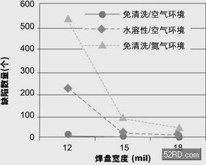 圖2是三種不同組裝工藝中錫橋與元件間隔之間的關系。從圖中看出,元件間隔在0.012英寸或更大時沒有發生任何錫橋。免清洗焊膏在空氣環境中焊接產生的錫橋數量最少,為14個;水溶性焊膏在空氣環境中焊接產生的橋接數量排在第二,為99個;而免清洗焊膏在充氮環境中焊接產生的橋接數量最多,有866個。此外在最小的0.008英寸間距下,用免清洗焊膏在空氣環境焊接時18種焊盤中有12種焊盤沒有產生任何錫橋,用水溶性焊膏在空氣環境中焊接時有10種焊盤沒有錫橋,而使用免清洗焊膏在充氮環境中焊接時只有6種焊盤沒有產生錫橋。