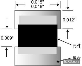 圖4給出批量進行0201元件回流焊時的元件焊盤設計建議。建議兩焊盤間距0.009英寸,焊盤長度0.012英寸,寬度在0.015英寸到0.018英寸之間,具體取決于助焊劑成分類型和焊膏回流焊環境。0.018英寸寬度適用于充氮焊接環境、氧氣含量很低(50ppm以下)以及焊劑活性很強或潤濕時間很短的情況;而0.015英寸寬度焊盤則適用于在空氣環境中進行回流焊接、焊膏溶劑活性較弱以及有較長的潤濕時間等情況。