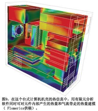 美國國家半導(dǎo)體的Webench在線設(shè)計工具采用Flomerics的Flotherm熱分析軟件,計算靜止空氣中的器件溫度。所有一般的仿真注意事項均適用。如果你的電路有風扇和一些氣流,其溫升就較低。如果有機箱,里面還有其它器件,其溫升就高。Flomerics采用有限元方案技術(shù)(參考文獻5)。圖9顯示了一個計算機機殼發(fā)熱與氣流的分析結(jié)果。很多其它有限元解算器也可以分析這種問題。例如,Comsol的一個解算器可以完成多重物理分析,可以解算超過一個問題的偏微分方程,如一只部件的熱響應(yīng),部件的導(dǎo)熱性能隨其溫度而變化。TI的Edwards指出,他的公司提供二種級別的熱建模抽象:ΦJB熱阻,以及Delphi緊湊模型標準。Flotherm、Icepak和很多其它熱分析程序都使用這些模型。