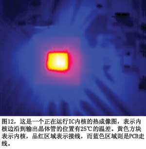 有關(guān)ESD二極管方法的另一個擔心是,IC芯片并不是等溫的,即它們在空間和時間上都不具備相等或恒定溫度。測量ESD二極管時并不能永遠保證測到的是內(nèi)核的最熱點。這里關(guān)注的是ESD二極管,它總是在芯片的邊沿,低于輸出晶體管的溫度。你可以獲得IC工作時的IR熱成像圖(圖12)。圖中明亮的白點比ESD二極管所在的內(nèi)核邊沿高25℃。當器件工作在高溫下時,可能需要降級使用(參考文獻8)。在150℃時,器件可能不能滿足電路的要求。