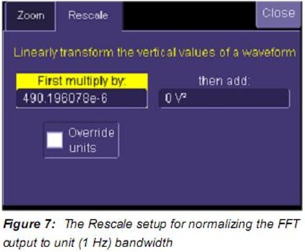 另一個(gè)進(jìn)行噪聲“點(diǎn)”測量的方法是采用可選的窄帶功率測量。窄帶功率(nbpw)通過計(jì)算給定頻率上的離散傅里葉變換測量功率。Nbpw的單位是dBm。噪聲測量不太方便,我們希望用噪聲功率譜密度線性單位V2√Hz來進(jìn)行測量。幸運(yùn)的是,力科示波器可以用腳本使用參數(shù)數(shù)學(xué)修改測量。這允許更復(fù)雜的計(jì)算而不是Figure 9所示的參數(shù)的簡單比率峰值系數(shù)。