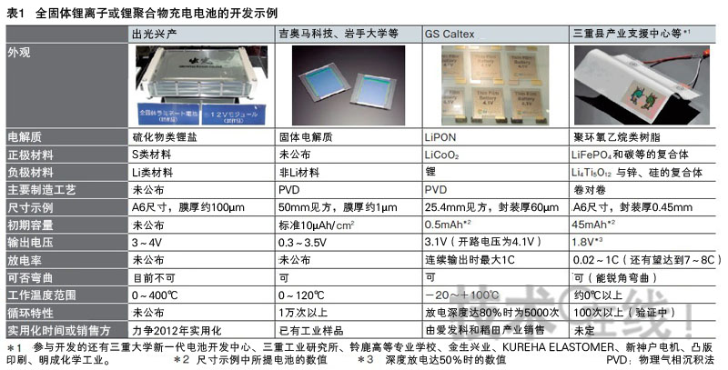表1:全固體鋰離子或鋰聚合物充電電池的開發示例