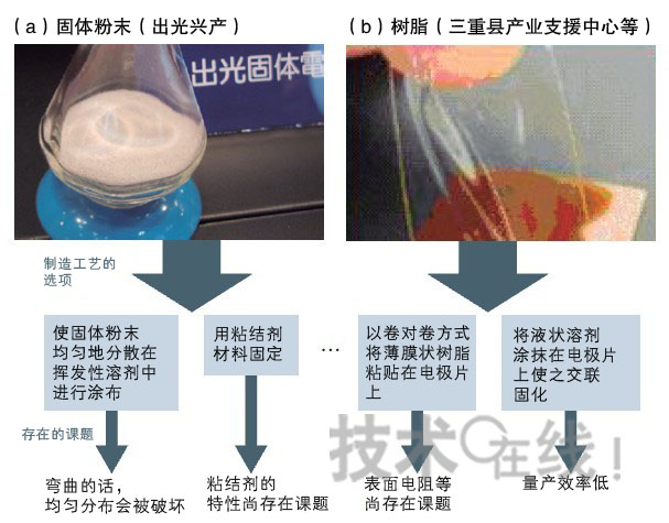 出光興產正在研究借助硫化物類粉末來形成均一電解質層的方法(a)。三重縣產業支援中心等為了降低電解質與電極片之間的表面電阻,目前正在研究在電極片上涂抹樹脂溶液后,通過交聯形成高分子的方法(b)。 三重縣產業支援中心使用樹脂作為電解質。由于是“非凝膠狀的無漏液干樹脂”(該中心高級部件技術革新中心業務總負責人伊坪明),因此適于以卷對卷方式進行量產。不過,在實用化方面還存在需要攻克的課題。該中心“將努力通過降低表面電阻使輸出電壓提高至目前的兩倍”(伊坪明),目前正在研究向電極片涂抹溶液狀樹脂使之交聯固化的方法。