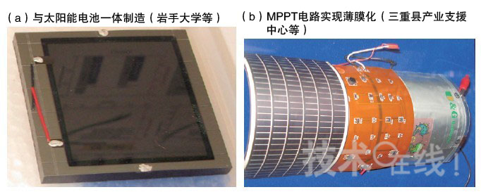 (b)為三重縣產業支援中心等的開發示例,與太陽能面板、最大功率點跟蹤(MPPT)電路,以及鋰聚合物充電電池進行了組合。