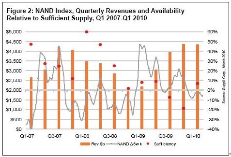 第一季度NAND平均價格下降4%,而2009年第四季度是下降1.4%。相比于這些相對溫和的變化,2009年第一季度大漲34%。