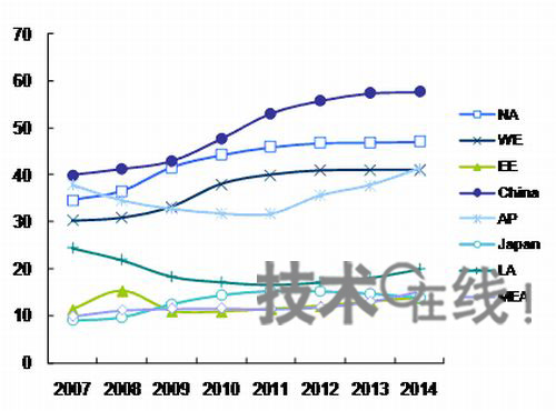 2010年中國的電視市場規(guī)模將達(dá)到4800萬臺,按供貨量計算,規(guī)模為全球最大。其他新興市場國家的需求2010年也將開始恢復(fù)。到2014年,亞太地區(qū)的電視供貨量將超過西歐,新興市場國家將推動全球電視市場擴(kuò)大。