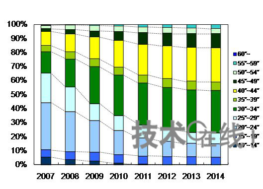 40英寸以上的電視在整體中所占的比例預(yù)計2010年會超過30%。2013年會達(dá)到40%,之后將基本飽和。分地區(qū)來看,中國正在追趕在電視大型化方面領(lǐng)先的北美和西歐,從這一點(diǎn)來看,中國的影響力會擴(kuò)大。