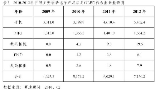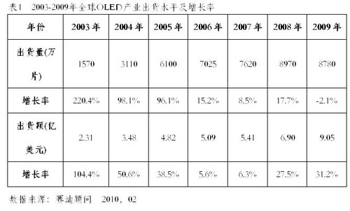 2010年4月13日,中國權威ICT研究與管理咨詢機構賽迪顧問股份有限公司在“2010中國消費電子市場年會”上發(fā)布《2009-2010年中國OLED產業(yè)發(fā)展研究年度報告》顯示:隨著手機和MP3/MP4等應用產品需求的推動,OLED顯示屏市場自2003年開始快速成長,到2009年,全球OLED出貨量達到8780萬片,由于受到全球終端產品有所減緩的影響,特別是手機和MP3市場出貨量的下滑,加上PMOLED全球產量明顯降低,但AMOLED在得到面板廠商大力推動下,特別是像諾基亞、三星、索愛等終端廠商,均在2009年推出一系列采用AMOLED屏幕的手機,在應用市場的推動下,AMOLED有了較大的增長,不過OLED總體仍有所下滑。伴隨著AMOLED出貨量的增長和市場比例的提升,OLED整體產值有明顯的增長,2009年產值達到9.05億美元,較2008年成長31.2%,出貨量在下滑的同時,而出貨額保持增長,AMOLED貢獻極為明顯。
