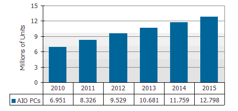 圖二:2010-2015年AIO PCs出貨量預測(單位:百萬臺)