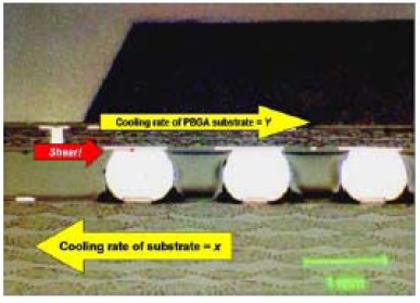 [page]在焊接大熱容量和多層線路板時,光有底部紅外預熱是不夠的。由于熱容量大,底部熱能很難完全傳遞到線路板上方,焊接時焊料在從底部向頂部滲透的過程中溫度越來越低,最終焊料凝固而不能達到IPCIII標準所規定的75%以上透錫。對于無鉛焊接,焊料流動性差,這樣的問題就愈發突出。而頂部熱風預熱可以很明顯地改善透錫效果。(見圖10)