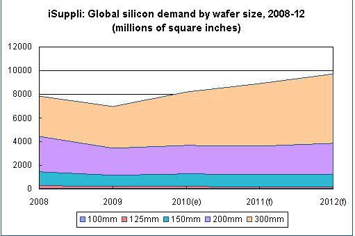 iSuppli:2008年至2012年,全球不同尺寸半導體硅片市場需求量狀況