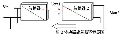 要實現節能循環利用,主要考慮將消耗在電阻負載上的能量更加合理的利用。如果能將輸出電壓Vout再還原為輸入電壓Vin,則輸出電能轉換為輸入的電能,便可以實現電能的循環利用,如圖2所示:將原有轉換器的電阻負載R1用等效輸入阻抗的轉換器2取代,轉換器2的輸出接轉換器1的輸入。則與R1等效輸入阻抗的轉換器2從轉換器1輸出端消耗的能量被轉換到轉換器1的輸入端,再經轉換器1又到轉換器2的輸入端,實現了能量的循環利用。如果在理想情況下,沒有轉換損耗,則系統可以自循環工作。當然這是無法實現的,所以在能量分析時,要引入轉換過程的消耗。