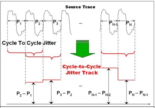 相鄰周期抖動(Cycle to cycle jitter)是時鐘相鄰周期的周期差值進行統計與測量的結果。如圖4所示,后一時鐘周期減去前一時鐘后作為統計的樣本,C1=P2-P1, C2=P3-P2, Cn-1 = Pn - Pn-1,把C1到Cn-1進行數理統計,同理,可以計算出Cycle to cycle jitter的峰峰值和RMS值。