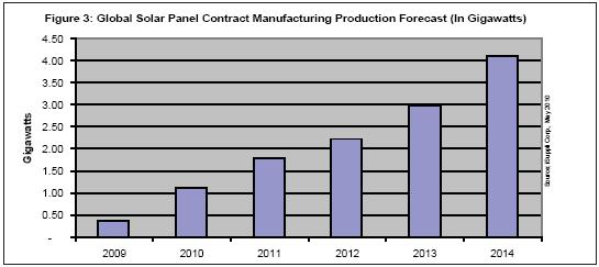 2010年合同制造商將生產1.1GW的太陽能電池板,比2009年時的369MW大增200%。其余的生產任務將由專門的太陽能電池板廠商以及其它企業承擔。2014年合同制造商生產的太陽能電池板將比2010年增長近三倍,達到4.1GW。