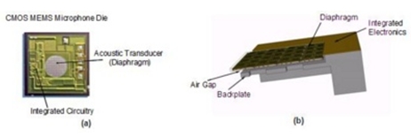 CMOSMEMS麥克風芯片的俯視圖(a)和橫截面圖(b)。