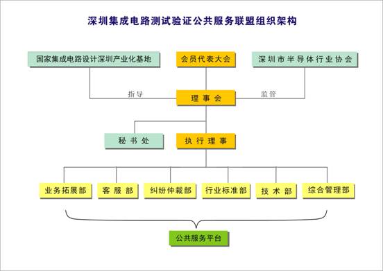 如上圖所示,會員代表大會由IC設計公司,封裝測試廠,設備廠商,高校,研究所和電子制造工廠代表組成,是深圳集成電路測試驗證公共服務聯盟的最高權力機構,下設理事會,理事會是聯盟管理的智囊團,各種規章制度的起草者和重大事務的決策者,其下又設執行理事和秘書處,執行理事負責日常事務的實際運行,是公共服務聯盟的操作單位,秘書處主要負責會員代表大會的召開以及日常會員事宜的組織,執行理事又下設業務拓展部、客服部、糾紛仲裁部、行業標準部、技術部和綜合管理部。