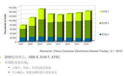 STB 2009年逆勢增長。大城市發展方向是高清和雙向機頂盒;中小城市是STB的成長主力。