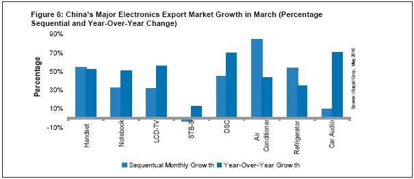 圖6所示為3月份中國主要電子產品的出口增長情況。