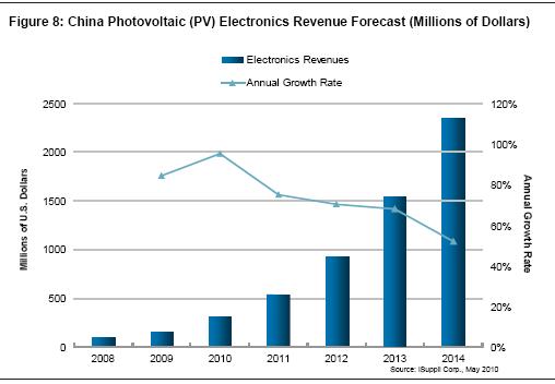 隨著政府補貼計劃在2010年達到頂點,光伏電子市場也將同時觸頂。盡管預計接下來三年年增長率下降——除非出臺新的政策,但該市場將繼續保持一定的勢頭,足以在2014年實現24億美元的銷售收入。