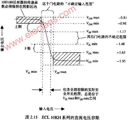 圖2.15舉例說明了MOTOROLA10KH射極耦合邏輯門電路在25℃環境溫度條件下的電壓容限,這此邏輯門電路都是對輸入電壓敏感,保證0和1轉換的電壓門限在圖中以VOLMIN和VIHMAX數值形式表示。接收到的電壓低于VILMIN則保證為邏輯0響應,高于VMMAX則保證為邏輯1響應。落在兩個門限之間的接收電壓可能被接收電路判決為1,也可能為0,或者為一個不確定狀態。