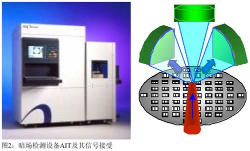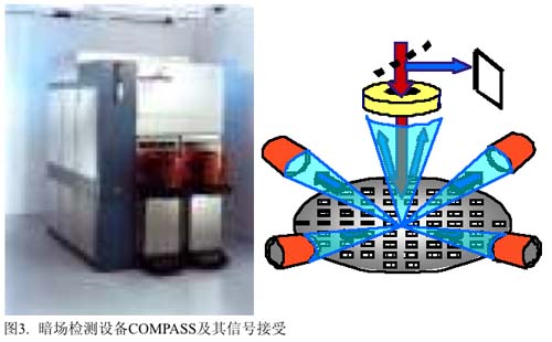 暗場檢測技術作為檢測晶片缺陷的有效手段之一,其優點在于以下幾個方面:首先,在暗場獲得圖像的灰階易于控制和調節。暗場是位于硅片上方和硅片成30度角的區域,在此區域內獲得的圖像灰階,可以通過調節激光的能量和探測器的敏感度來輕松控制;其次,在暗場內,可以很容易地辨認有具體形態和位于硅片表面的缺陷,比如刮傷、微粒之類的缺陷;最后,使用暗場的檢測速度非常快,成本相對比較低,通常被用作快速分析影響產量的各類缺陷超出界定值的問題,AIT和COMPASS是在半導體制造企業廣泛應用的暗場檢測設備(如圖2和3所示)。[page]