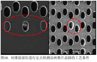 自動工藝檢測技術是對電子束檢測技術補充。在實際生產過程中,常常能發現通孔刻蝕的一些系統性缺陷,它主要由于刻蝕設備及其工藝在調試過程中還沒達到最好的工藝窗口,或者工藝窗口的漂移使刻蝕設備的一些薄弱部位提前顯現在通孔刻蝕工藝過程中。實驗過程中通過對一顆產品的薄弱部位進行定點檢測,來反映整片晶圓的工藝條件(如圖10所示)。