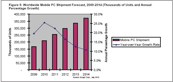 圖5所示為iSuppli公司對(duì)直至2014年的全球移動(dòng)PC出貨量預(yù)測(cè)。