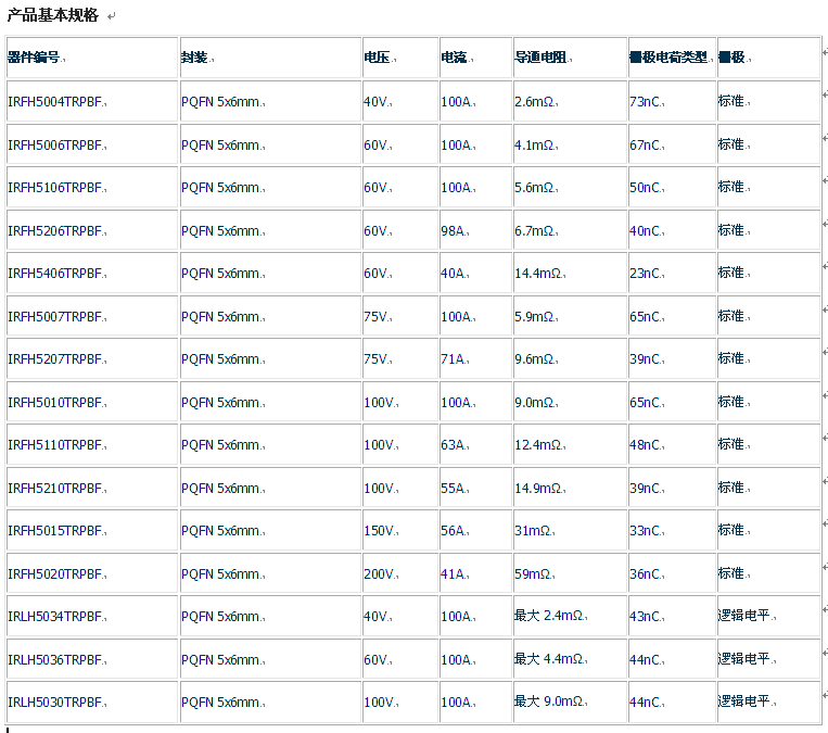 新的功率MOSFET采用了IR最新的硅技術來實現基準性能,適用于網絡和電信設備的DC-DC轉換器、AC-DC開關電源(SMPS)及電機驅動開關等開關應用。由于新器件滿足40V到250V的寬泛電壓,所以可提供不同水平的導通電阻(RDS(on))和柵極電荷(Qg),為客戶的特定應用提供優化的性能和更低成本。