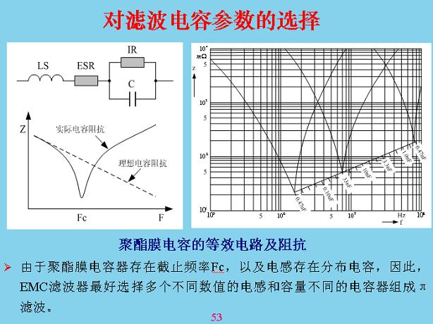 對于濾波電容,大家注意前面的EMC濾波,這個電容不是理想電容,里面有一個電感,還有漏電電阻,里面有串聯(lián)電阻,電感和電容有沒有產(chǎn)生串聯(lián)諧振?曲線是這樣一條斜線,串聯(lián)諧振相當(dāng)于把信號短路掉了,信號短路的阻礙很大,這里面有一個最佳值,然后成為感線,進(jìn)行EMC電路設(shè)計的時候最好用不同的電容進(jìn)行配模,這是0.4的曲線,33nF并聯(lián)就可以保證在上面不是好的,單獨(dú)一個電容后面覆蓋不到,以后有機(jī)會我講這些元器件,你們在大學(xué)里面學(xué)的是符號,對電阻電容基本是不懂的,還有電組電容這方面的問題最多,還有電容,電容來回極化的時候,速度跟不上外面的變化,會損耗相當(dāng)大,會燒壞,特別是脈壓電容,很多人認(rèn)為體積越小越好,但沒有考慮在開關(guān)上容易出現(xiàn)問題。
