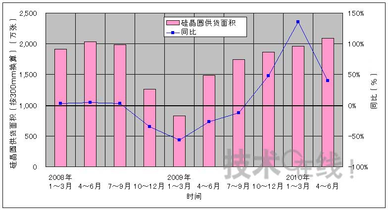 國際半導體制造設備材料協會(SEMI)公布了2010年第二季度(2010年4~6月)的全球半導體用硅(Si)晶圓供貨業績。發布資料顯示,硅晶圓供貨面積在2009年第一季度(2009年1~3月)觸底后連續五個月增加,突破了2000萬片(按300mm晶圓換算,下同)大關。超過了此前的歷史最高記錄——2008年第二季度(2008年4~6月)的1946萬片,刷新了歷史記錄。
