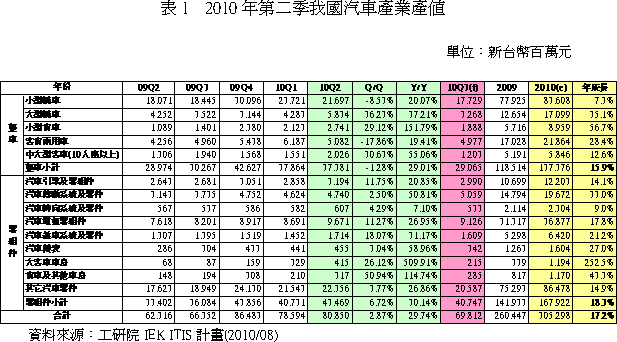 2010年第二季汽車產(chǎn)業(yè)總產(chǎn)值預(yù)估為新臺(tái)幣808.5億元,較上一季成長(zhǎng)2.87%,較2009年同期成長(zhǎng)29.74%(表1)。