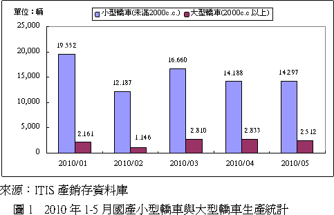 觀察1-5月國(guó)產(chǎn)小型轎車與大型轎車生產(chǎn)情形(圖1),小型轎車1月份的產(chǎn)量遠(yuǎn)高于其他月份,乃部分產(chǎn)量對(duì)應(yīng)2009年貨物稅減徵期間尚未消化的訂單,另外2月份較少的生產(chǎn)日數(shù)造成整車產(chǎn)量為各月中最低者,特別是大型轎車的部分。 相較于2010年第一季,預(yù)估第二季整車總產(chǎn)值衰退1.28%,小型轎車產(chǎn)值衰退8.5%,而大型轎車產(chǎn)值則有36.2%的成長(zhǎng)。