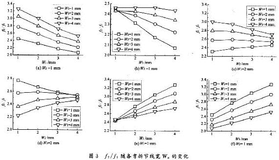 依次改變各彎折節(jié)的線長(zhǎng)Ln(n=1,2,3)和線寬Wn(n=1,2,3),計(jì)算出天線的第一諧振頻率f1和第二諧振頻率f2。通過(guò)比較f2/f1的變化來(lái)研究各彎折節(jié)幾何參數(shù)對(duì)天線諧振特性的調(diào)節(jié)作用。
